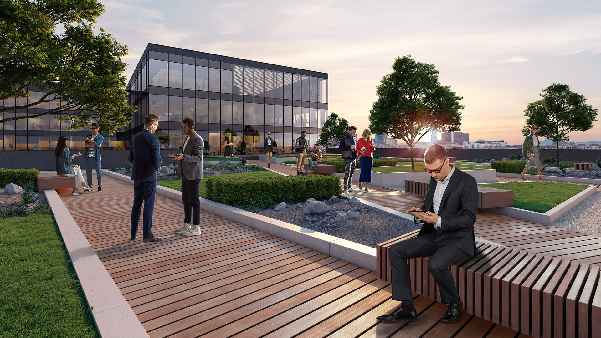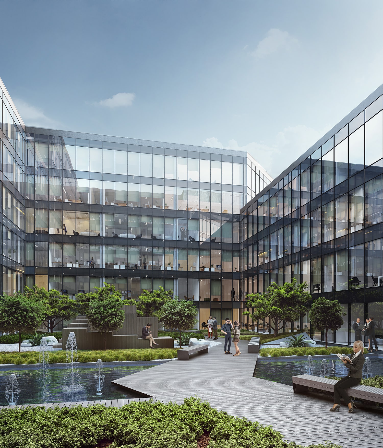 Budynek zapewni najemcom od 3. piętra aż do ostatniej kondygnacji dostęp do zielonych tarasów w układzie kaskadowym. Zajmą one ponad 1,6 tys. mkw. Wszyscy użytkownicy biurowca skorzystają z wysokiej jakości powierzchni do pracy, ale również znajdą chwilę relaksu na terenie wewnętrznego patio o powierzchni ponad 1000 mkw. Na dziedzińcu powstaną liczne strefy zieleni i małej architektury. Latem wytchnienie przyniesie oczko wodne oraz fontanny. Patio z powodzeniem może też spełnić funkcje przestrzeni eventowej i miejsca integracji lokalnej społeczności obiektu.