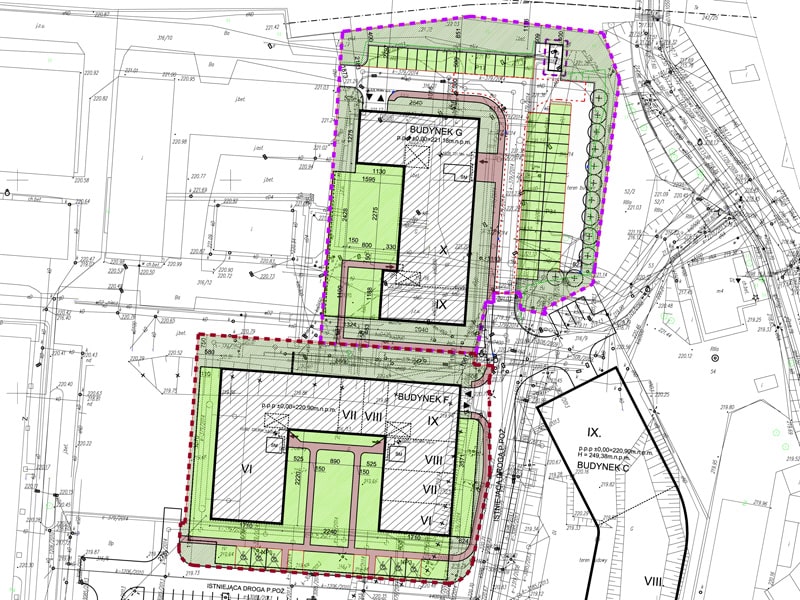 W ramach etapu zaprojektowano dwa budynki mieszkalne w układzie korytarzowym. Budynek F jest budynkiem średniowysokim o wysokości 6 do 9 kondygnacji, zaprojektowany w układzie podkowy z dziedzińcem otwierającym się na południe. Zabudowa narasta stopniowo we wschodniej części budynku wytwarzając 3 kondygnacje tarasowe, eksponowane na zachód i południe.