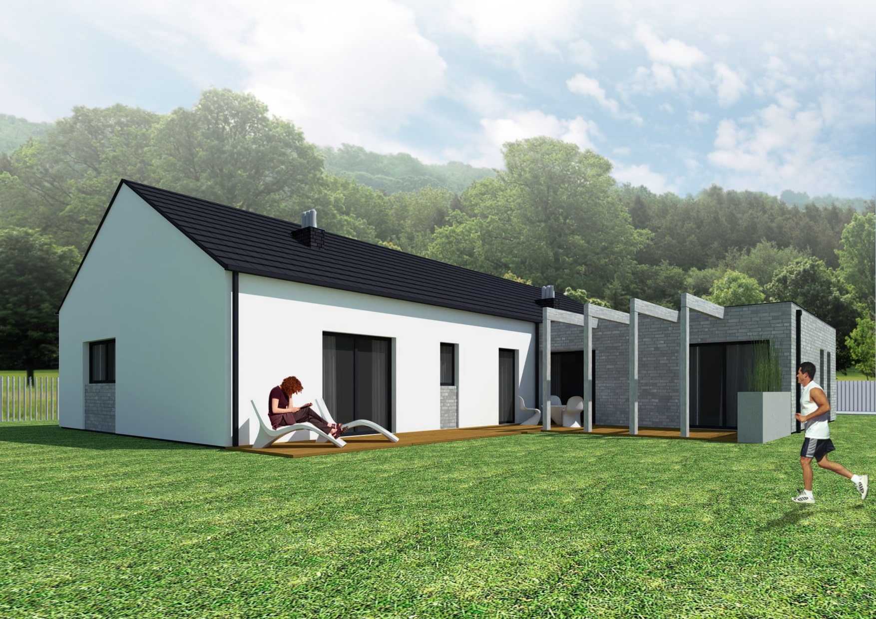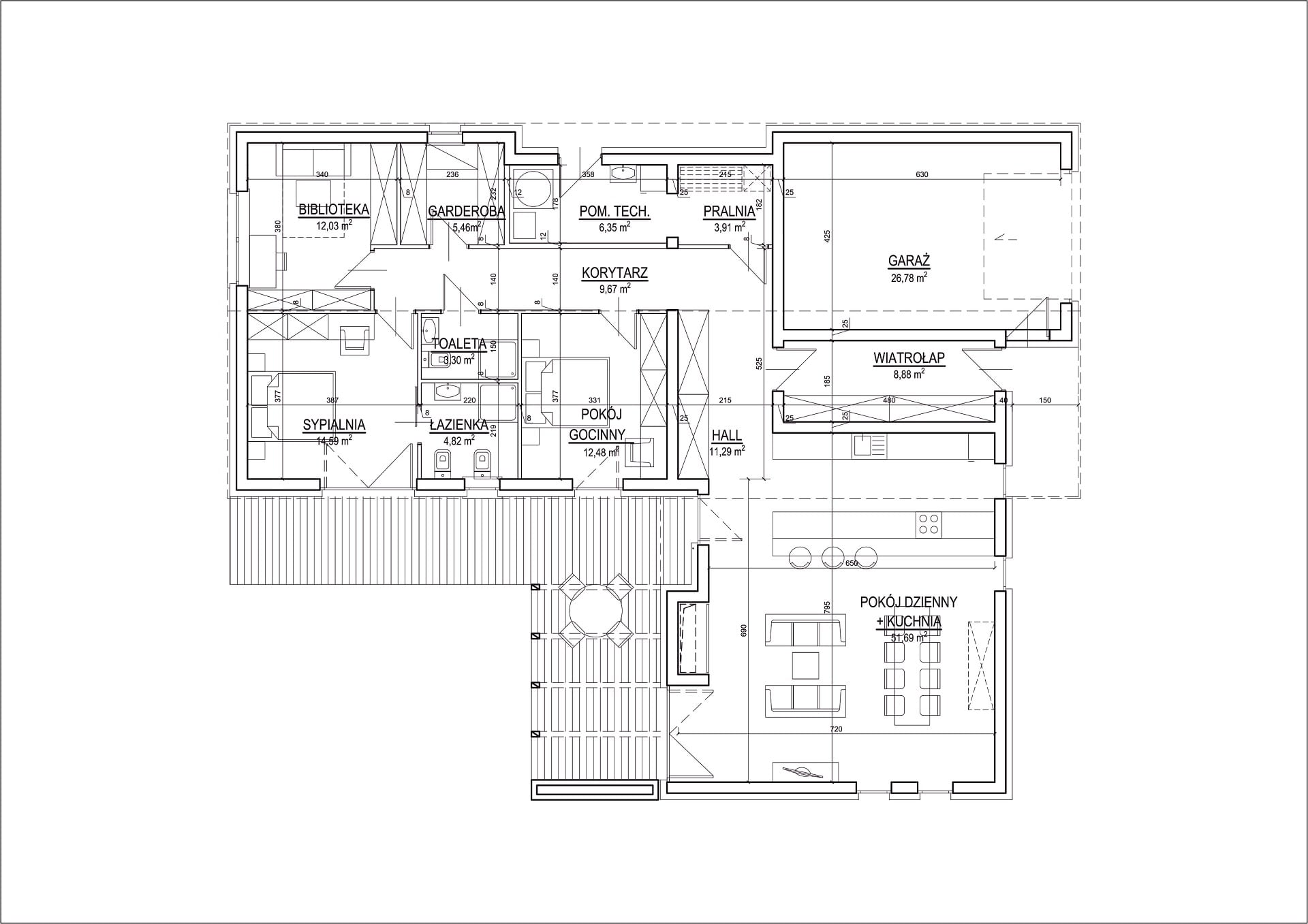 Budynek jest parterowy, na planie litery L – pozwoliło to na wykształcenie prywatnego, ukrytego tarasu użytkowego, dostępnego z wszystkich pomieszczeń mieszkalnych, w którym sam kształt budynku ogranicza nadmierne nasłonecznienie.