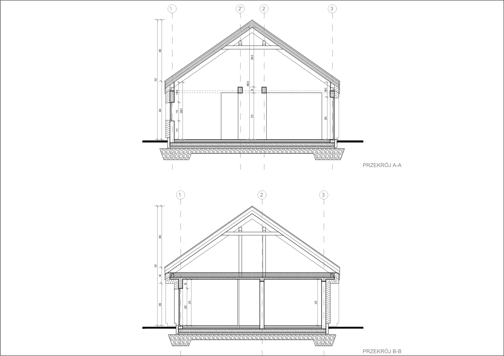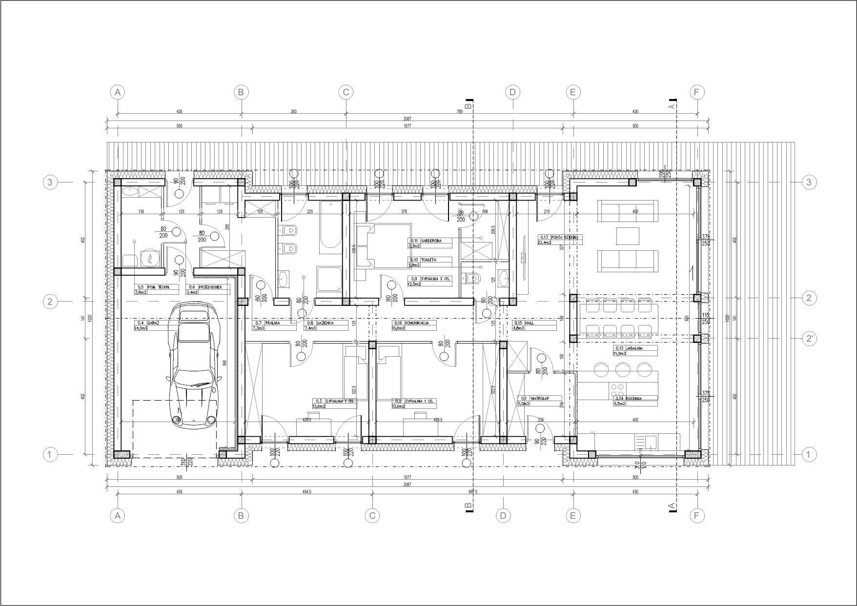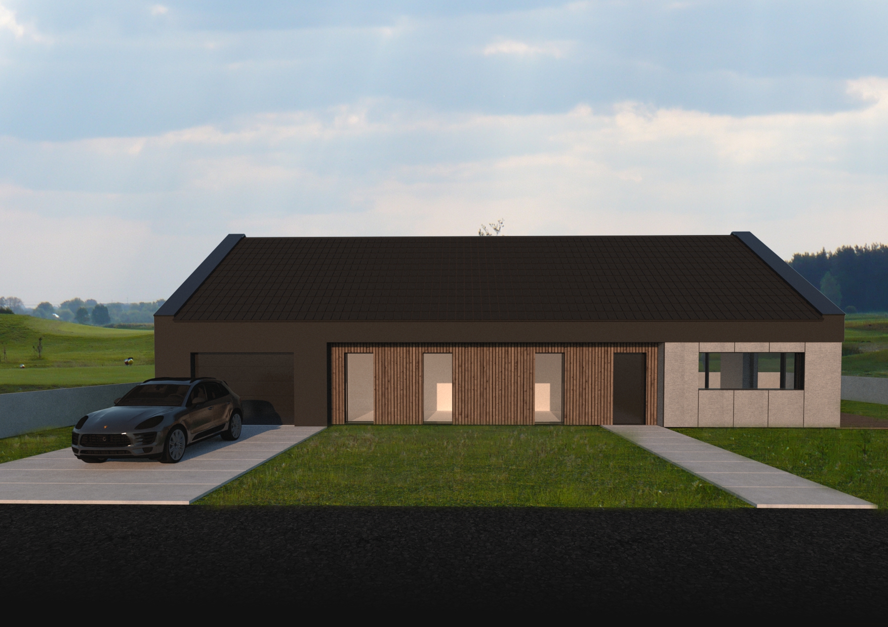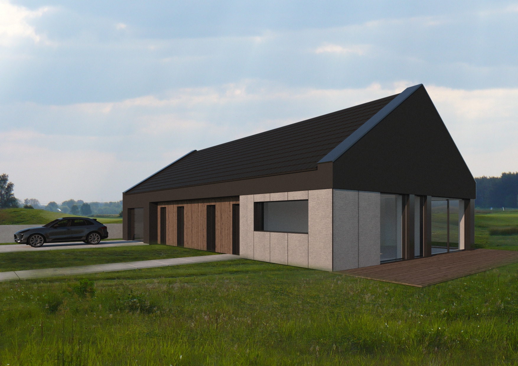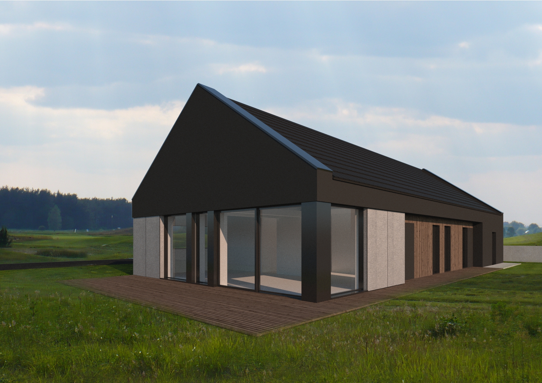 Rzut budynku został wykształcony na podstawie prostokąta o proporcjach boków ok. 2:1. W celu zaakcentowania wejścia oraz zapewnienia intymności i zacienienia w sypialniach, zostały wprowadzone podłużne podcienia, które dodatkowo podkreślają symetrię bryły. Podcienia zostaną wykończone w naturalnej okładzinie drewnianej – dodadzą lekkości w ciemnej bryle.