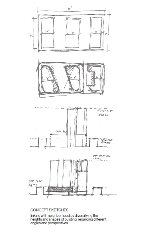 Kompleks składa z 2 wież biurowych i jednej wieży mieszkaniowej osadzonych na wspólnym 5-kondygnacyjnym podium, w którym znajdą się liczne lokale gastronomiczne, handlowe i usługowe. Wieże biurowe liczące po 25 pięter i 100 m wysokości, zapewnią dostęp do wysokiej klasy powierzchni do pracy. Budynek mieszkaniowy zaoferuje zaś 760 mieszkań o zróżnicowanym metrażu.